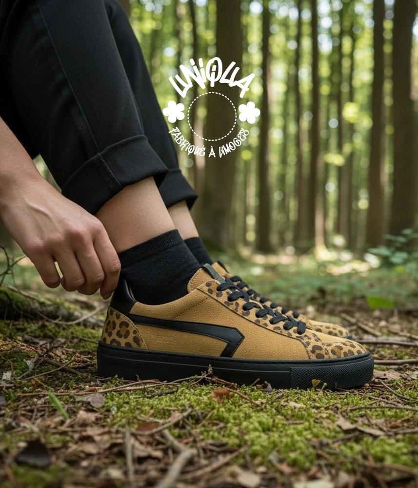 Nous vous proposons notre modèle ORSAY avec cette version « Velours Naturel Imprimé Panthère« .