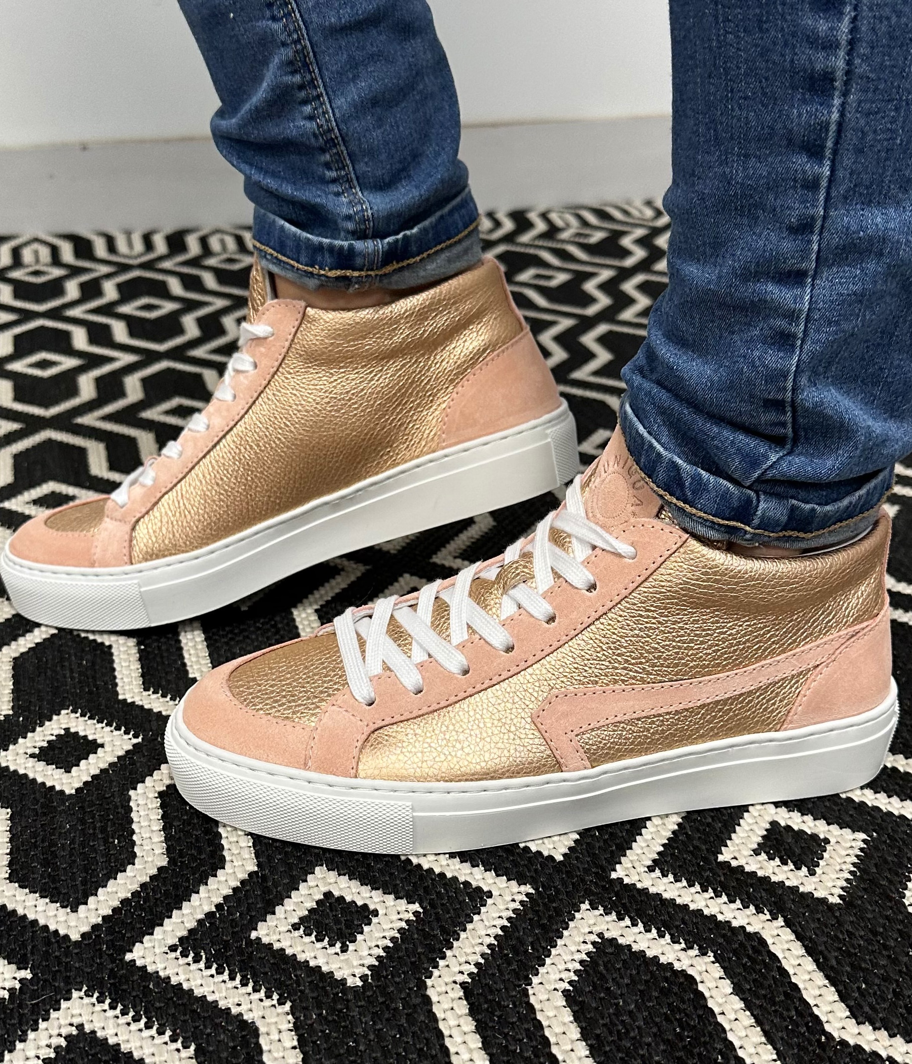 Nous vous proposons notre basket BELLEGARDE avec cette version utilisant notre cuir Métallisé Or Rose accompagné du Velours Rose.