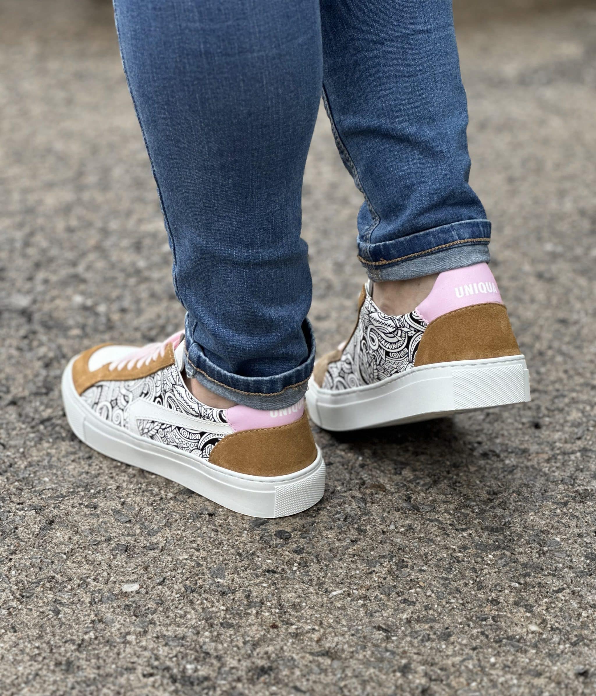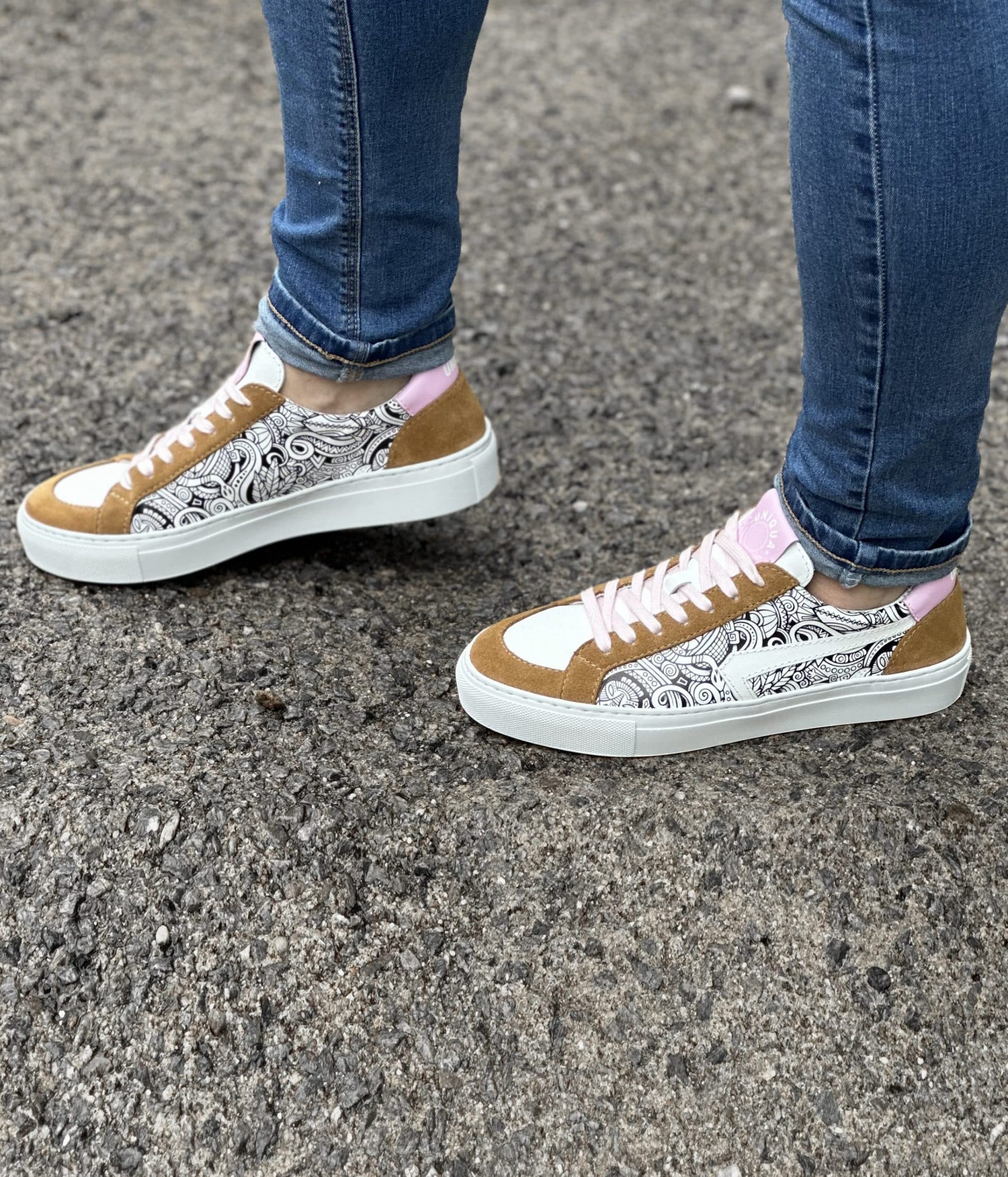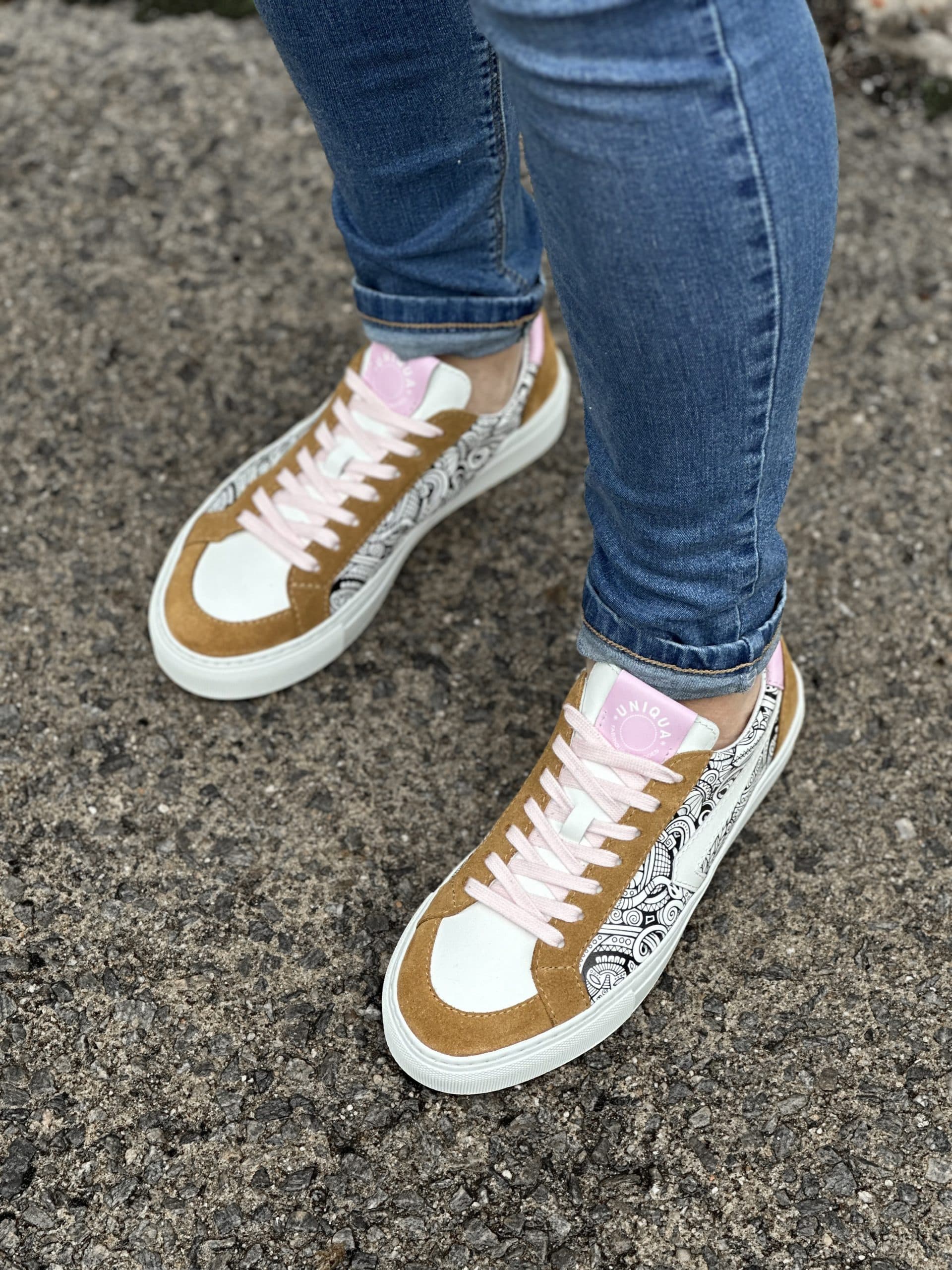 Nous vous proposons notre basket ORSAY avec cette version utilisant notre motif AFRICANA agrémentée de Velours coloris Naturel et cuir coloris Rose.
